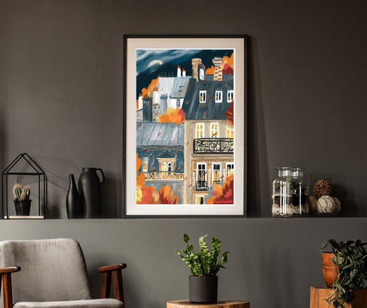 A Parisian Autumn by the Seine -Cozy Bookstalls and Golden Leaves Poster|Paris Fall Art Print for Book Lovers